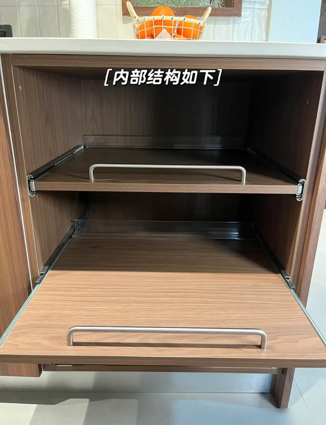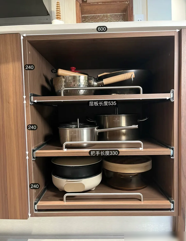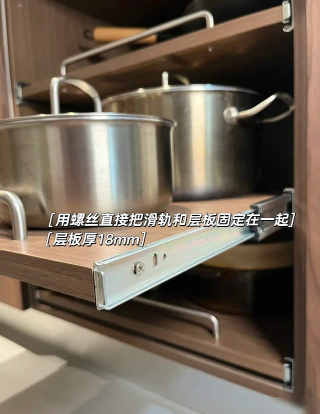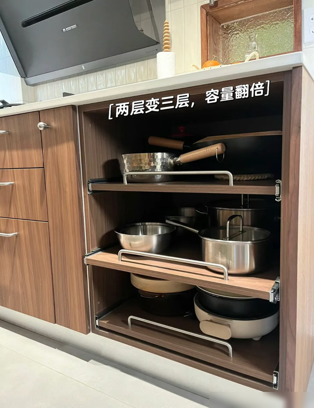 现在的厨房装修越来越讲究“动线合理”,这种抽拉柜把垂直空间榨干用尽,三层层板塞下十几个锅具轻轻松松。轨道带缓冲的设计也很贴心,用力推拉不怕夹手,比传统柜门顺手多了。我家去年改造橱柜时也参考了类似思路,把调料瓶、干货罐全换成抽拉式收纳,台面瞬间清爽一半。